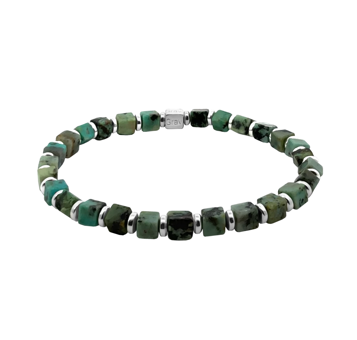 Az ízlésesen megkomponált, kis afrikai türkiz kockákból, hematit kiegészítőkből és egy kiemelkedő ezüst 925 kockából álló férfi karkötő nemcsak látványos ékszer, hanem az afrikai türkiz inspiráló és védelmező erejét is magában hordozza. Úgy tartják, hogy az afrikai türkiz segít oldani a stresszt, támogatja a belső egyensúlyt, erősíti az önbizalmat és fokozza a magabiztosságot – így viselője harmóniában, belső erővel és pozitív energiával vághat neki mindennapjainak.