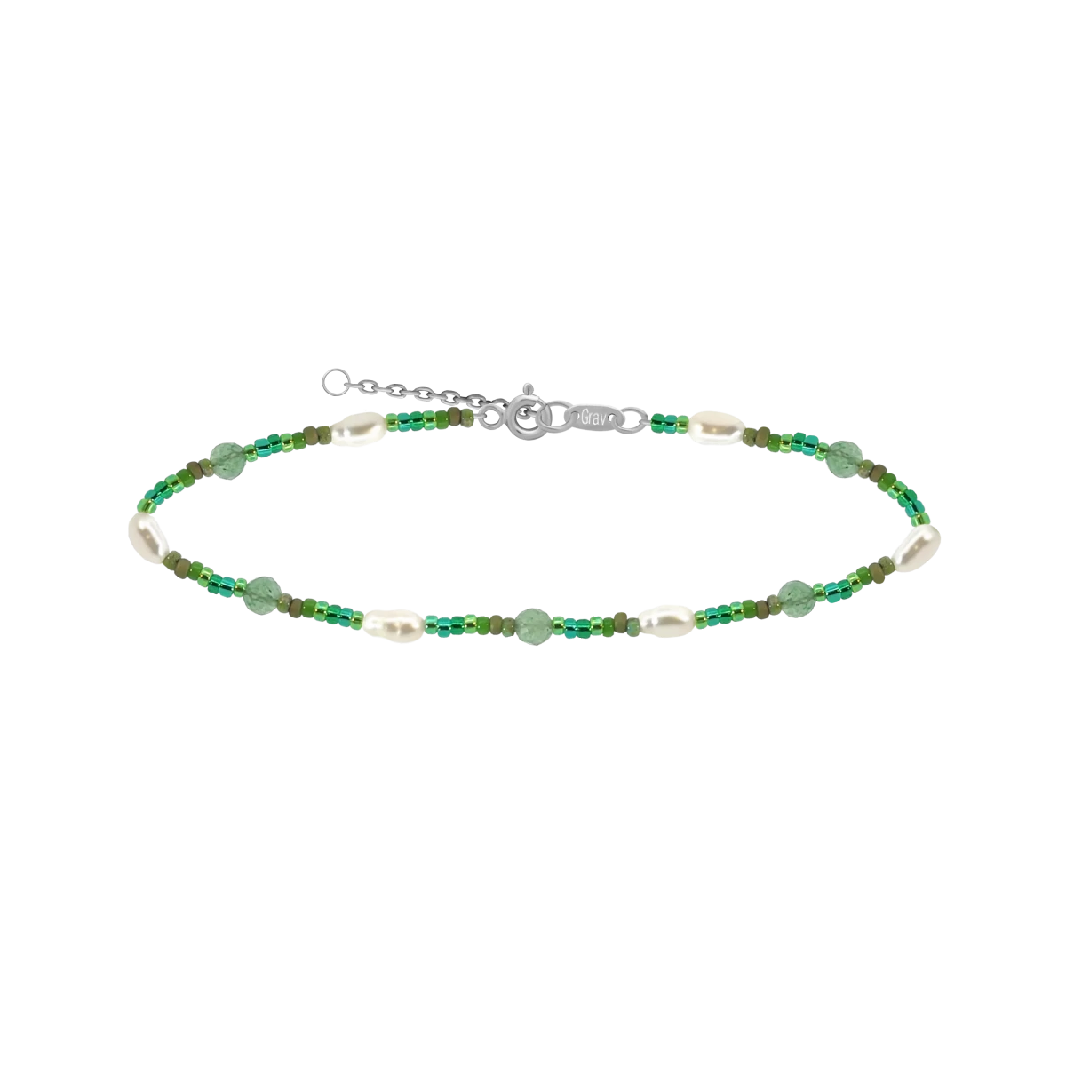 Ez a karkötő ünnepi ragyogást sugároz a domináns zöld design gyöngyöknek és a csillogó zöld aventurinnak köszönhetően, amelyek friss, mégis kifinomult megjelenést biztosítanak. Az aventurint sokan a harmónia, a szerencse és a pozitív energiák kövének tartják, így különleges jelentéssel gazdagítja ezt az egyedi ékszert. A finom, fehér rizsszem gyöngyök gyönyörű kontrasztot alkotnak a zöld árnyalatokkal, még elegánsabbá téve a karkötőt. A lánchosszabbítónak köszönhetően könnyedén méretre állítható, így tökéletes választás, ha ünnepi hangulatot és természetes eleganciát szeretnél viselni.