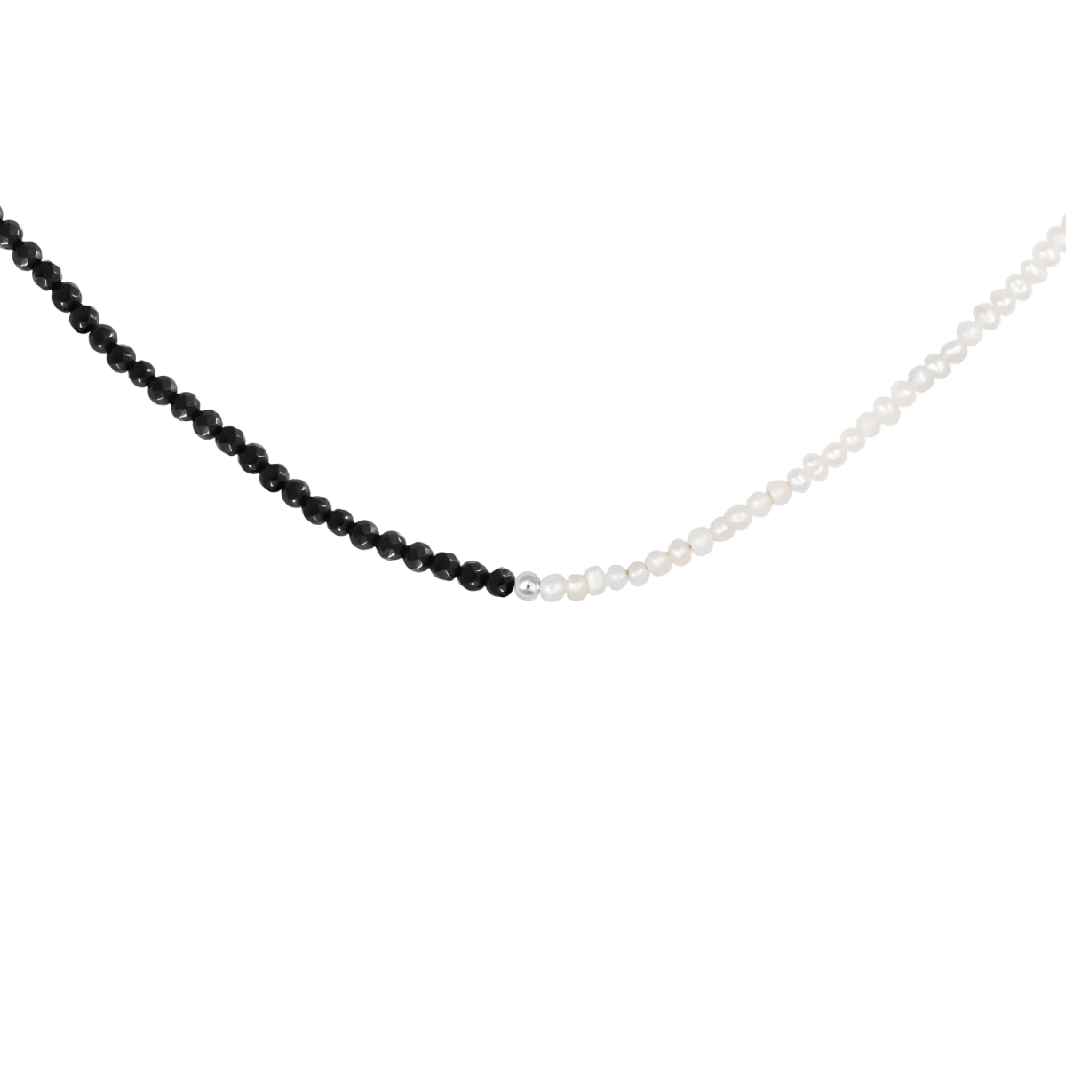 Fazettált fekete ónix, kis édesvizi gyöngy és egy darab ezüst golyó találkozása egy klasszikus, ugyanakkor igazán stílusos ékszerben. A tökéletes alkalmi- és ünnepi megjelenés záloga. Viseld szettben a kollekció karkötő darabjával és az eredmény magáért fog beszélni! Az alkotóelemek damilra vannak felfűzve.
