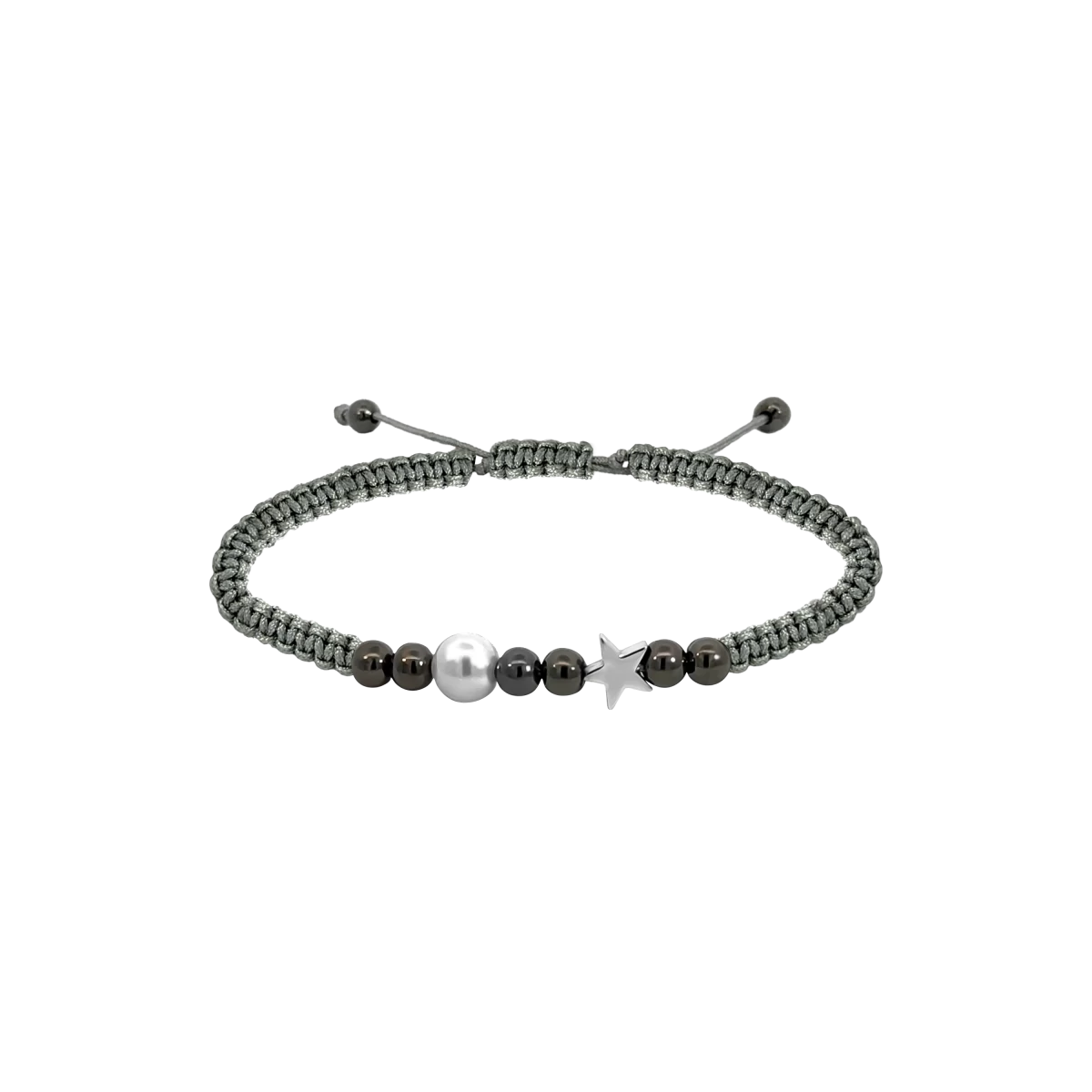Ez a makramé technikával készült karkötő nemcsak tartós és szakadásmentes fonalból készült, hanem egyedi megjelenést is kölcsönöz viselőjének, amit a középen elhelyezkedő hematit csillag és a hat darab ónix golyó varázsol igazán különlegessé, míg az egyetlen ezüst golyó diszkrét, mégis elegáns fényével tündököl.