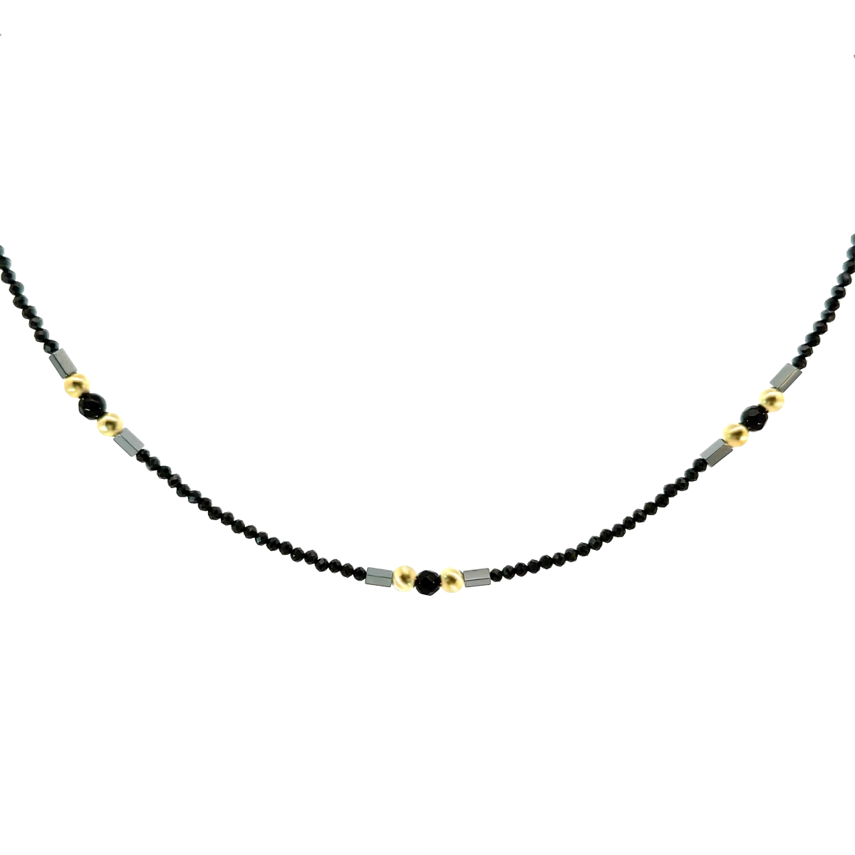 Egyedi, kézzel készített nyaklánc feketes spinellel, fazettált fekete ónix-szal, hematittal és sárga arannyal bevont, 925-ös finomságú ezüst golyókkal. Egy igazán elegáns fekete szépség, az alkalmi megjelenés tökéletes kiegészítője.