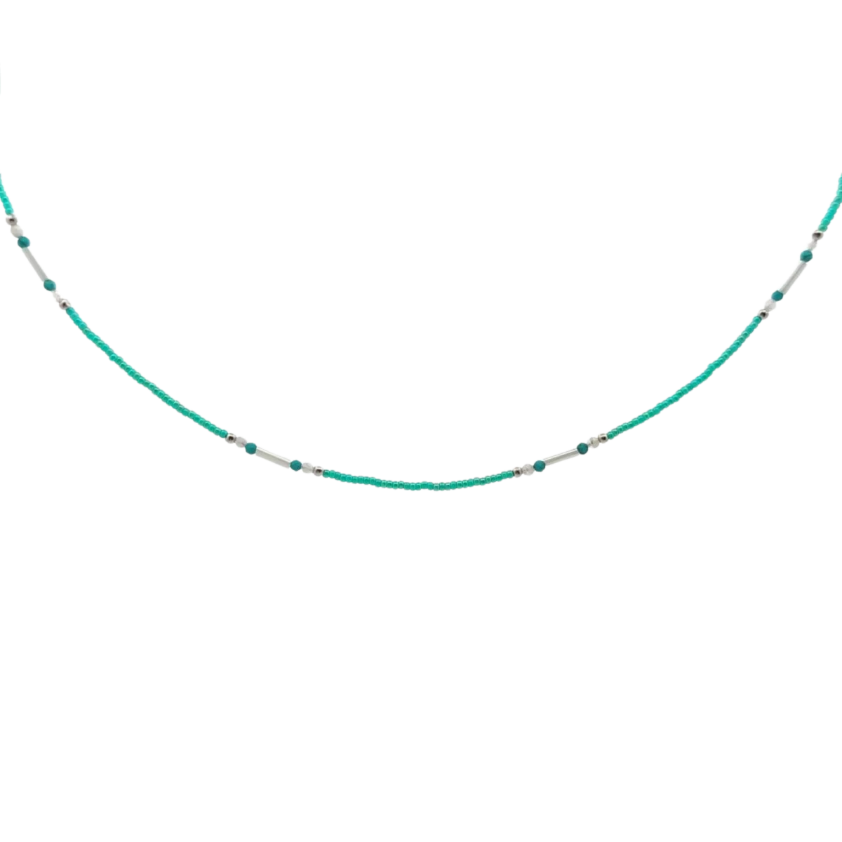 Türkiz színű design gyöngyből, holdkőből, 925 finomságú ezüst golyóból fűzött nyaklánc a zöld szín kedvelőinek. Divatékszer, amely a játékosság és a harmónia jegyében készült.